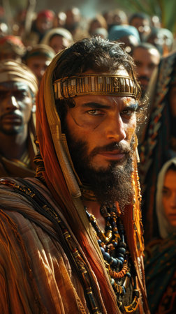 close-up shot of Prophet Moses, with a long white beard and a dark turban, leading his followers through the desert.