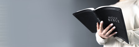 Close up of hand holding holy bible book. Concept of faith, spirituality and religion.