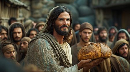 Jesus Christ gives bread to poor people, kindness and selflessness, central figure in Christianity, faith hands food eat pray God catholicism biblical love man spiritual good