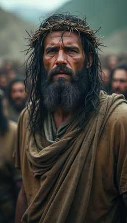 Jesus Christ wearing a crown of thorns and white chiton toga mantle cape himation suffering for mankind's sins in artistic mystical portrait