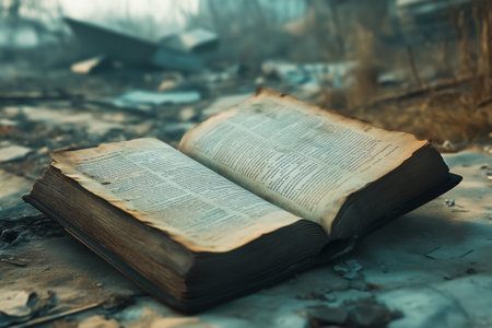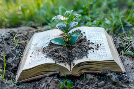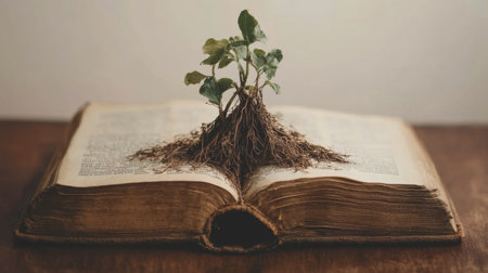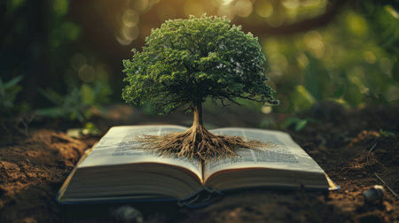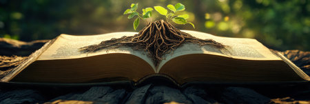 Roots break through the pages of an old book, symbolizing the connection between knowledge and nature in a tranquil forest setting during daylight