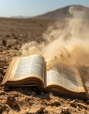 An ancient, open book rests upon the cracked earth of a desolate landscape.