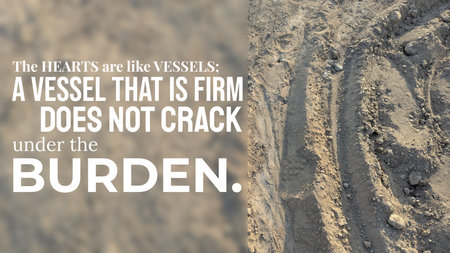An analogy comparing hearts to firm vessels that can endure burden displayed in bold white text over a blurred background juxtaposed with a clear image of textured soil on the right.