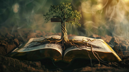 This captivating image features a wooden cross rising from the center of an open book, surrounded by rich soil and budding green plants. The soft sunlight filtering through the trees creates a serene atmosphere, representing the intertwining of knowledge and spirituality, where faith takes root and flourishes.