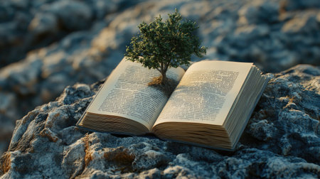 A small tree emerges from the pages of an open book lying in a rocky landscape,