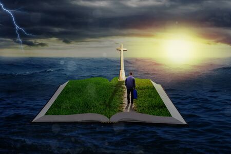 A man is holding a Bible in his hands. The Bible is open to a page with a cross on it. The man is standing in front of a grave