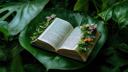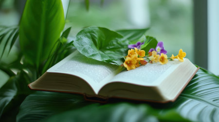 An open book rests gracefully on a large green leaf, surrounded by vibrant flowers and leaves, creating a captivating blend of nature and literature.
