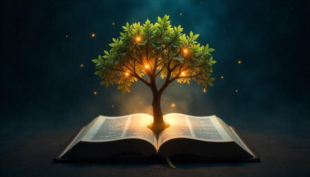 An old book lies open, its pages intertwined with roots, symbolizing the blend of knowledge and nature in a serene, green setting.