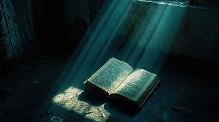 Open book bathed in a dramatic light beam, with shadows around creating a moody, dark background