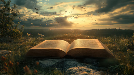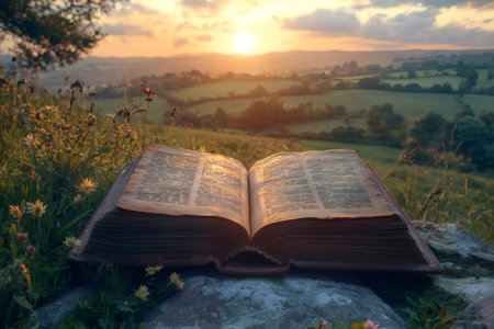 An open book rests on a rock in a peaceful countryside setting, illuminated by the warm glow of the setting sun