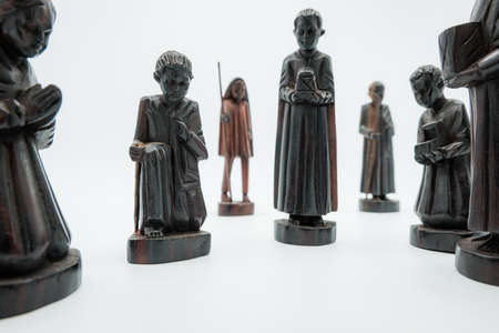 Dark wood Christian nativity scene figures of Biblical Magi isolated on white.
