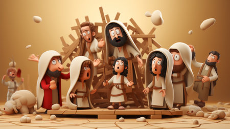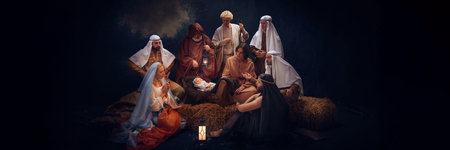 Christmas Nativity scene with Mary, Joseph, baby Jesus, shepherds and angels praying, reading Bible. Biblical moment of Jesus Christ birth