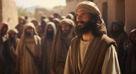 Calm and reverent nativity scene, showcasing shepherds and wise men gathered around Holy Family. Birth of Jesus Christ, holy moment
