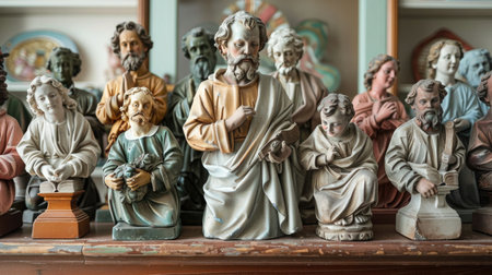 beautiful ceramic figurines of the mother of God joseph and baby jesus for the nativity scene on a dark brown background