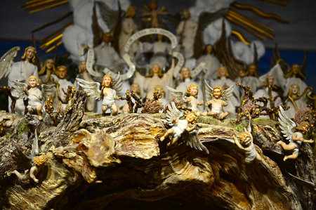 BOLOGNA, ITALY - FEBRUARY 18, 2019: lights are enlightening statues at stand in DEVOTIO Religious products and service exhibition