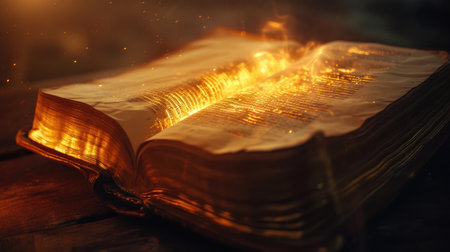 An open book resting on a rustic wooden table, illuminated by warm light. The inviting pages reveal text that sparks curiosity and contemplation.