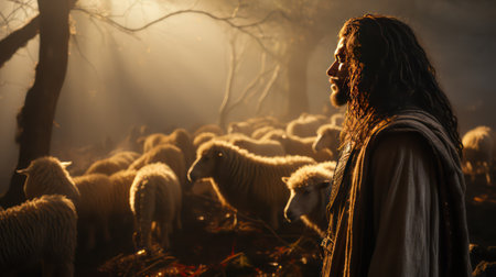 Jesus Christ with flock of sheep in the foggy forest at sunset