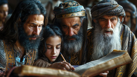 A Jewish family sitting together and reading from the Torah or other religious texts during a study session.