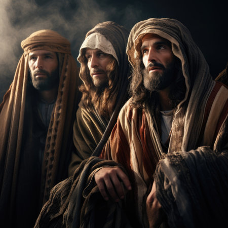 In a captivating moment, Jesus stands amidst his disciples, holding stones and offering wisdom as they sit on rugged ground, enveloped in soft lighting and dramatic skies.