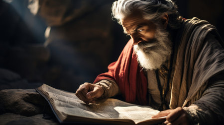 Portrait of a serious man with a beard and shawl looking at camera. Black and white tone. Biblical character.