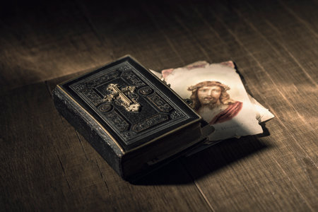 Sacred bible and Holy card with Jesus Christ image on a wooden desk, religion and faith concept