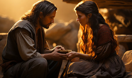 Jesus and Mary in the forest, 3d digitally rendered illustration.