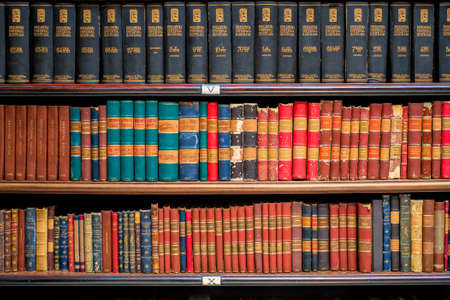 Background of old shabby books. Long background of vintage educational books and encyclopedias. The background of studying books old.