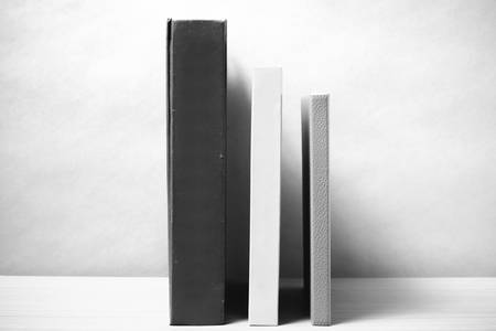Selective focus on volume ten of unidentified hardbound book collection in black and white