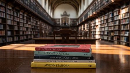 Cinematic wide shot (16:9) of a stack of academic journals (African diaspora studies) resting on a h