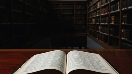 An open book rests on a wooden surface, displaying its detailed pages filled with text. Surrounding it are other books, showcasing a rich library atmosphere, perfect for promoting reading and literacy.