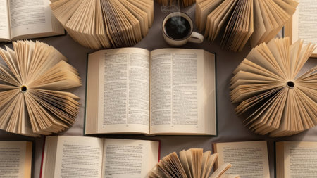 Close-up of a stack of open books, with pages slightly curled, inviting the viewer to explore the content within.