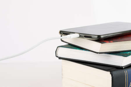 A close-up of a phone screen with an ebook app open, placed on several hardcover books, creating a visual blend of modern technology and traditional reading against a black backdrop.