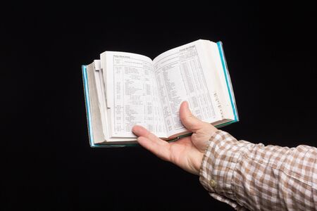 Man reading law dictionary with blurred bookshelf background, depth of field. Student with opened ancient big brown hardcover book in library. Knowledge, education concept. Clever people lifestyle.