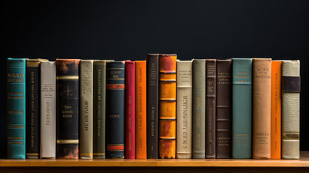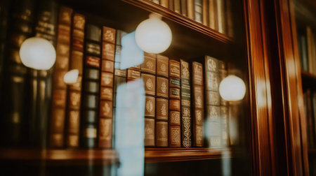 This stunning bookshelf displays a collection of classic literature, enhanced by soft warm light. The wooden finish and detailed book spines evoke a sense of elegance and intellect.