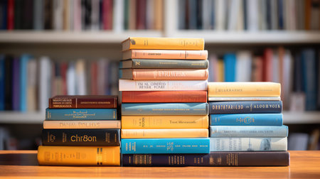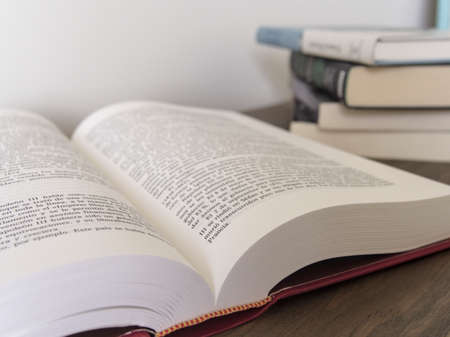 education and self-improvement, stack of books with one open on top of themshot from eye level with shallow depth of field