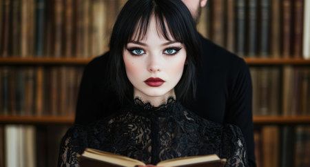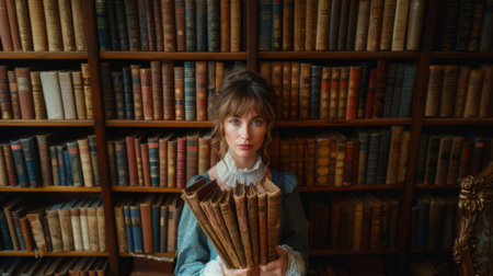 Captivating portrait of a young woman in vintage attire, poised amidst a vast collection of antique books in an elegant library setting.