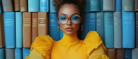 Fashionable woman in bright yellow, sitting against a tower of books, vibrant and intellectual vibe