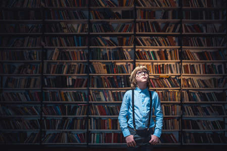 Adult student reading a book in the college library. Young positive male wearing glasses with bookshelves on background.