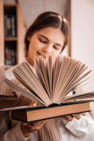 Close up of Caucasian beautiful young female student in glasses flipping pages, reading book and searching for information in library. Literature concept. Woman with textbook at bookshelves.