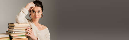 Emotional woman with eyeglass smiling and looking at camera while hiding her face behind a book against gray vintage wall background
