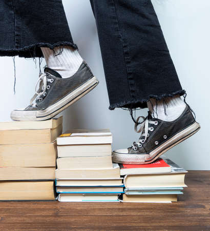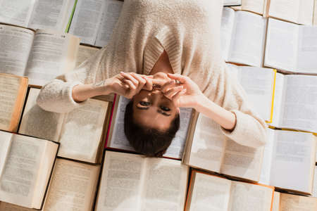 Exam stress, tired girl on the background of bookshelves. Natural sciences. A large amount of information. Student in the library, laconic minimalistic style