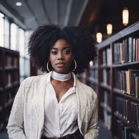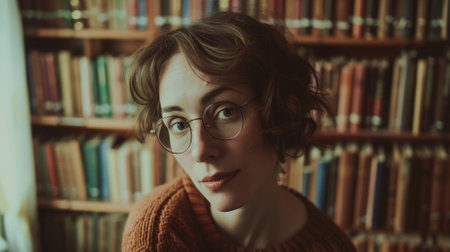 In a quiet library, a young woman with glasses stands between stacks of books, deeply focused on her reading. The warm ambiance enhances her concentration on the pages.