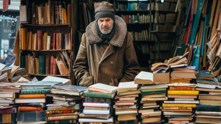 Young man browsing through a local bookstore, surrounded by wooden shelves filled with a diverse collection of literature and novels