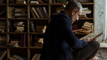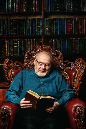 An old intelligent man reading a book in his library at home. Retirement. Retro style.