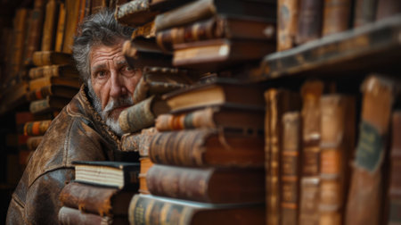Portrait of a student with a beard in a cozy public library with a book in his hands.Man with a beard stands in an atmospheric library and reads a book. Search for printed literature in the library.