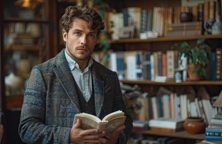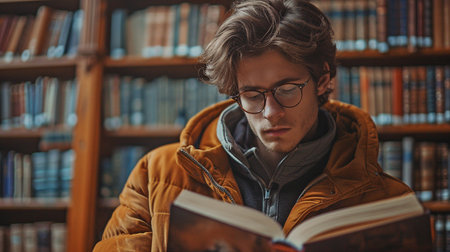 A contemplative man in glasses reading a book in a cozy library, surrounded by shelves filled with books and warm ambient lighting.