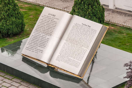 Three Gorges Dam, China - May 6, 2010: Yangtze River. One of many statues that are actually white explanation books about the dam and its environment. Green foliage in back.