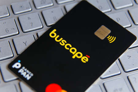Minas Gerais, Brazil - November 13, 2021: Buscape Pan bank logo credit card and Mastercard brand