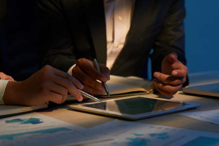 Business team hands at working with financial plan, meeting, discussion, brainstrom with tablet on office desk, Meeting concept.