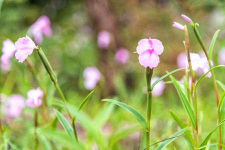 Delicate purple Ruellia flowers blooming amidst green foliage.